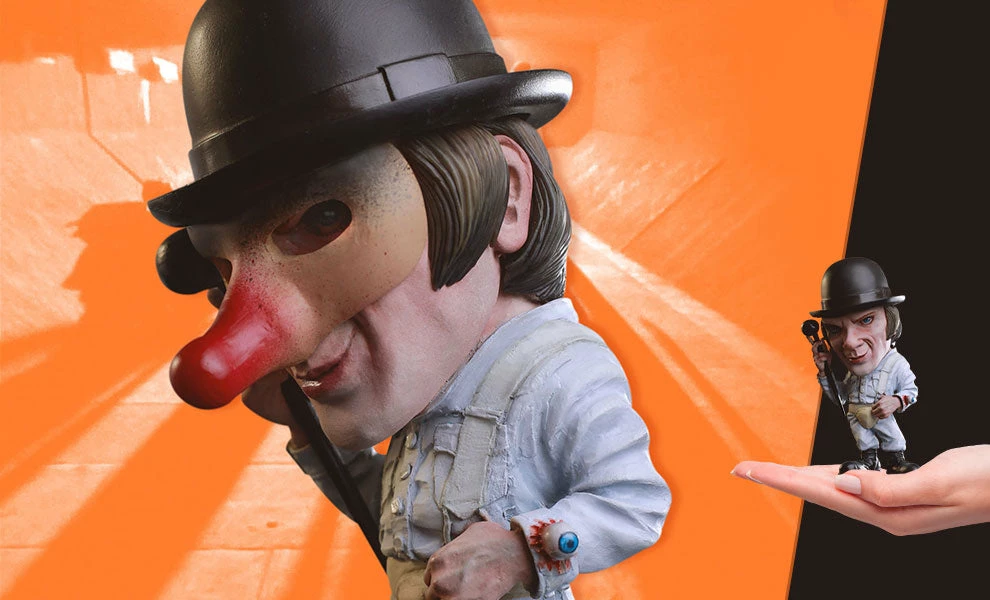 Star Ace is proud to present the first Defo Real figure from the Stanley Kubrick classic film, A Clockwork Orange. Alex DeLarge, as portrayed by Malcolm McDowell, was a juvenile delinquent prone to “ulta-violence” and anti-social behavior. This Defo Real features the realistic head of Alex on a stylized body dressed in his classic white gang costume and his bowler hat, and carrying a cane. A long-nosed mask magnetically attaches to the face.