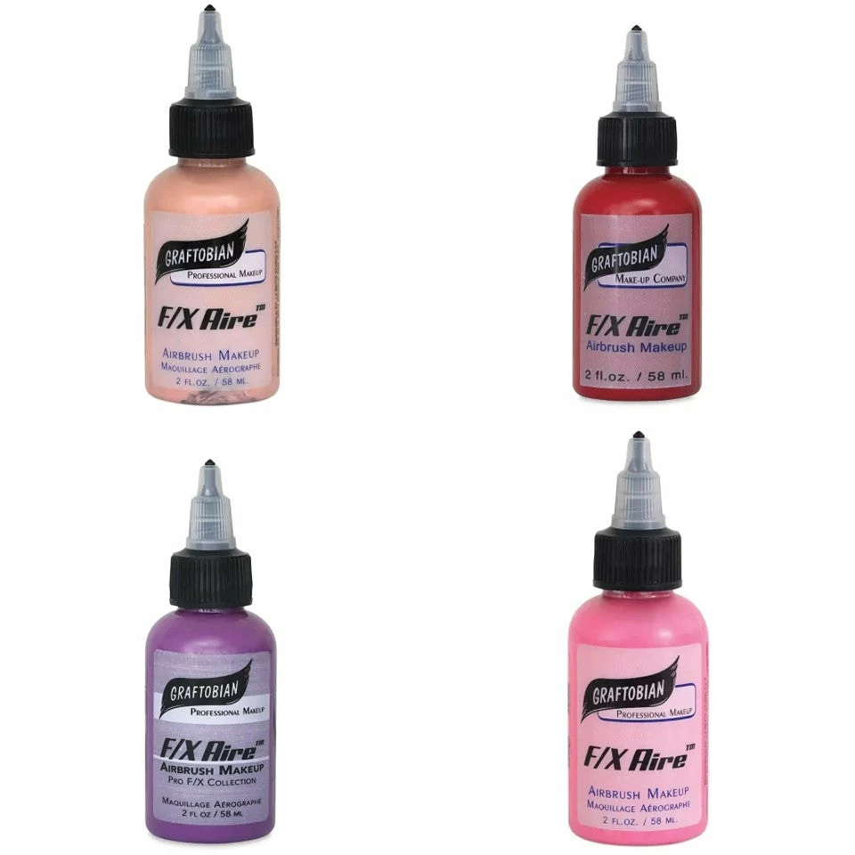 Professional-quality Graftobian F/X Aire Airbrush Face and Body Makeup is made with a hybrid water-alcohol formula that ensures long-lasting results. It goes on smooth and won’t clog your airbrush. This super-durable makeup is ideal for face and body art that needs to last 12–14 hours. It’s also good for long-lasting beauty and special effects applications. When the day is done, easily remove F/X Aire with soap and water. With its smooth, micronized formula, F/X Aire won’t clog airbrushes — even at low pressures. The makeup sprays on flawlessly at only 6–8 PSI. F/X Aire Airbrush Makeup comes in 2 oz (58 ml) bottles with dispenser caps. The colors mix and blend together beautifully. This makeup is vegan and made in the USA.