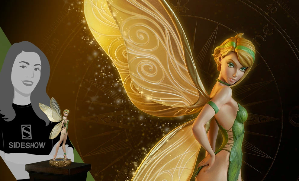 Based on J. Scott Campbell’s signature style, Tinkerbell shimmers with an air of mischievous magic. The polyresin pixie has detailed, translucent wings and an 11” wingspan, and her green leaf dress is intricately sculpted with natural textures befitting the Neverland native. Tink also has green accessories, including her necklace, armband, leg cuff, and the vines at her thigh.