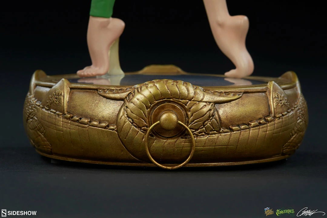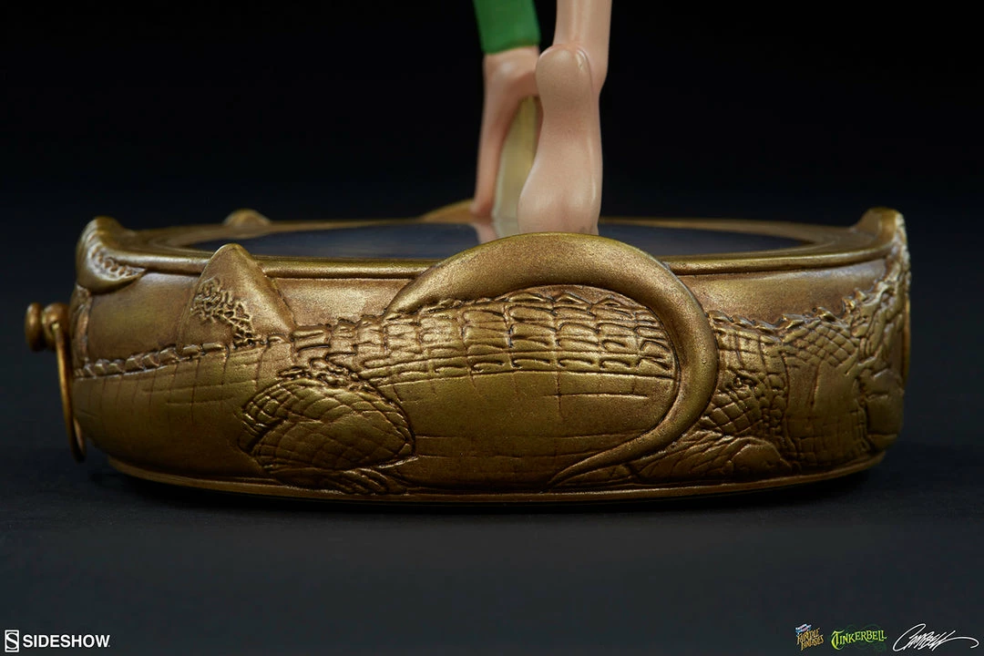 Tinkerbell stands 12” tall, strutting atop an intricate Neverland compass base that points the way to adventure. Detailed twin crocodiles are carved into the golden instrument, which has a realistic face beneath Tink’s delicate feet.