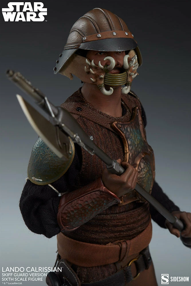 The Lando Calrissian Skiff Guard Version Sixth ScaleĀ Star Wars FigureĀ captures the Bespin baronās distinct disguised look fromĀ Star Wars: Episode VI- Return of the Jedi, as he accompanies the infiltration mission to Jabba the Huttās palace on Tatooine. The figure includes both an unhelmeted portrait with the detailed likeness of actor Billy Dee Williams and an alternate portrait with a non-removable helmet and mask as a part of his full guard uniform.